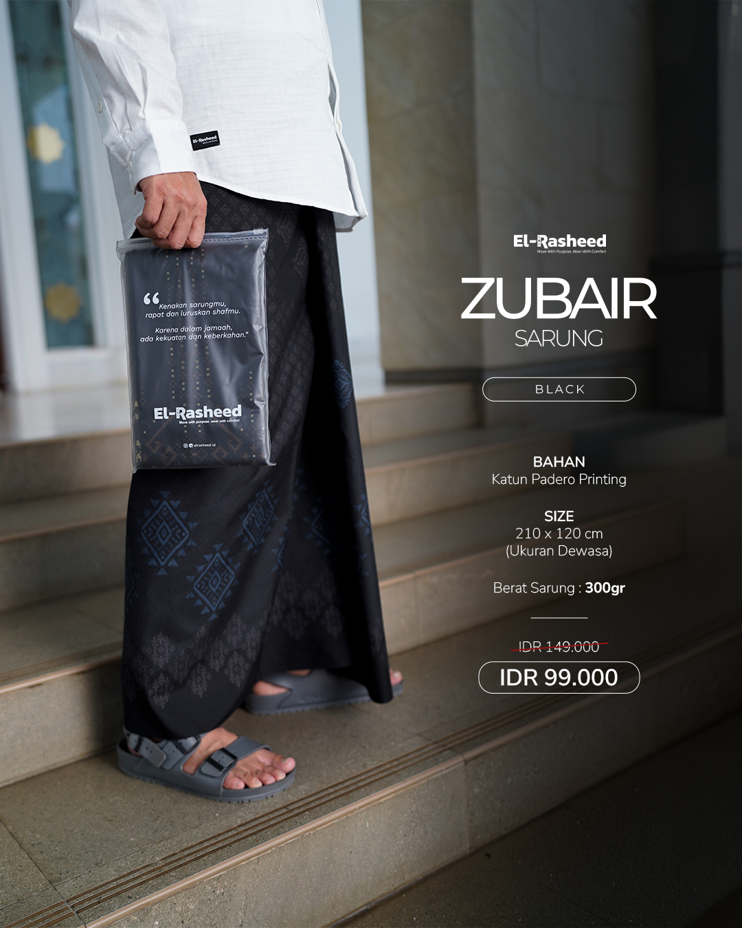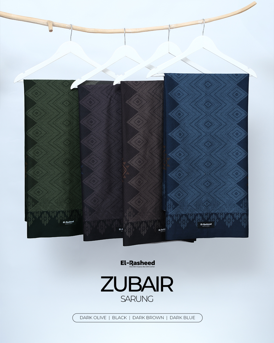 Sarung Zubair, koleksi Terbaru dari El-Rasheed dengan QC Improved. Dengan Pattern Ethnic yang diprinting Exclusive. Warnanya bold, dipilih agar memberi kesan maskulin.